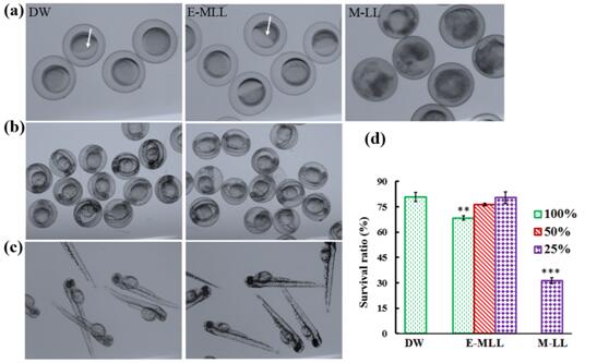 滲濾液 (M-LL),EDTA-Na2Zn處理后的滲濾液(E-MLL)及DI water (DW)處理后的斑馬魚發(fā)育形貌及存活率。