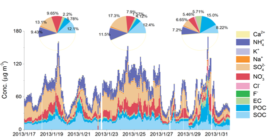 蘇州PM2.5水溶性離子和碳質(zhì)組分的時(shí)間序列變化圖;餅圖為三次霾污染事件中PM2.5的主要化學(xué)組成;POC和SOC分別代表一次有機(jī)碳和二次有機(jī)碳